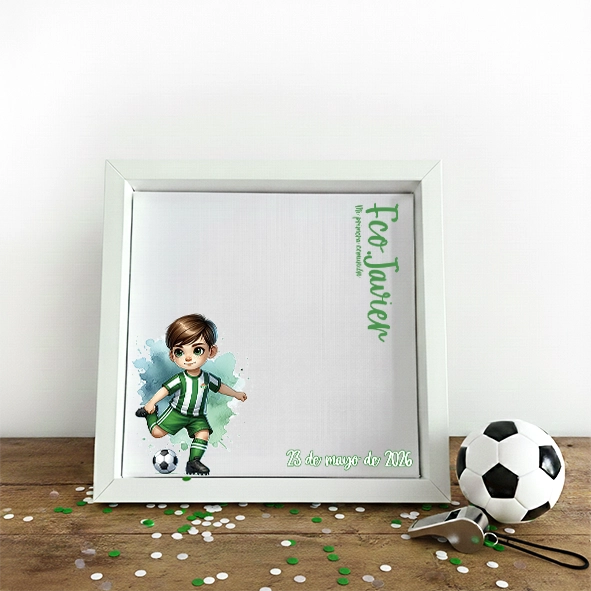 Cuadro de huellas personalizado Betis impreso sobre lienzo y enmarcado en madera (opcional). Te lo personalizamos para que quede a tu gusto con el nombre del niño, la fecha del evento y el dibujo de tu equipo favorito. Dependiendo de la carga de trabajo se puede elegir el color del texto y el color de ojos y pelo del niño (Se debe de consultar con anterioridad la disponibilidad de este servicio).