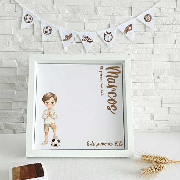 Cuadro de huellas personalizado Niño fútbol impreso sobre lienzo y enmarcado en madera (opcional). Te lo personalizamos para que quede a tu gusto con el nombre del niño, la fecha del evento y el dibujo de un niño de comunión con una pelota. Dependiendo de la carga de trabajo se puede elegir el color del texto y el color de ojos y pelo del niño (Se debe de consultar con anterioridad la disponibilidad de este servicio).