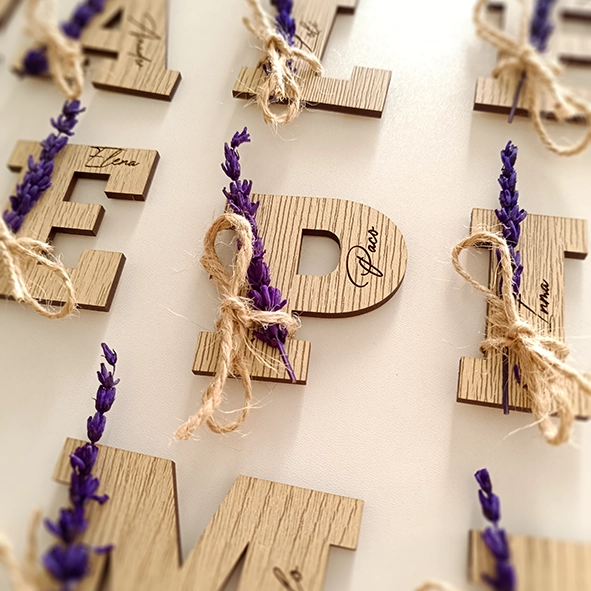 - Inicial: Cada pieza tiene la inicial del propio nombre del invitado.